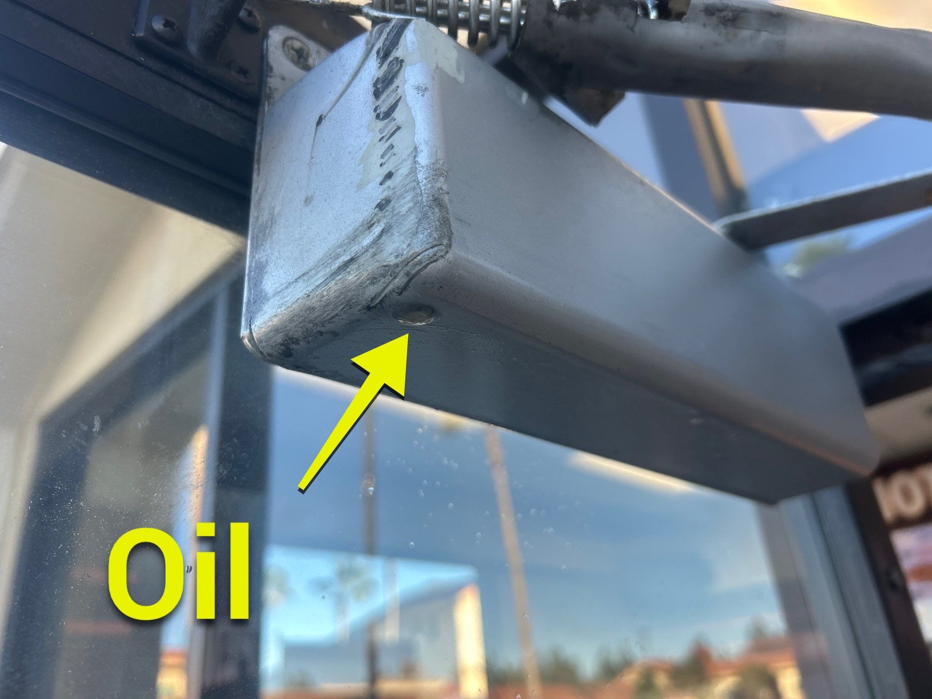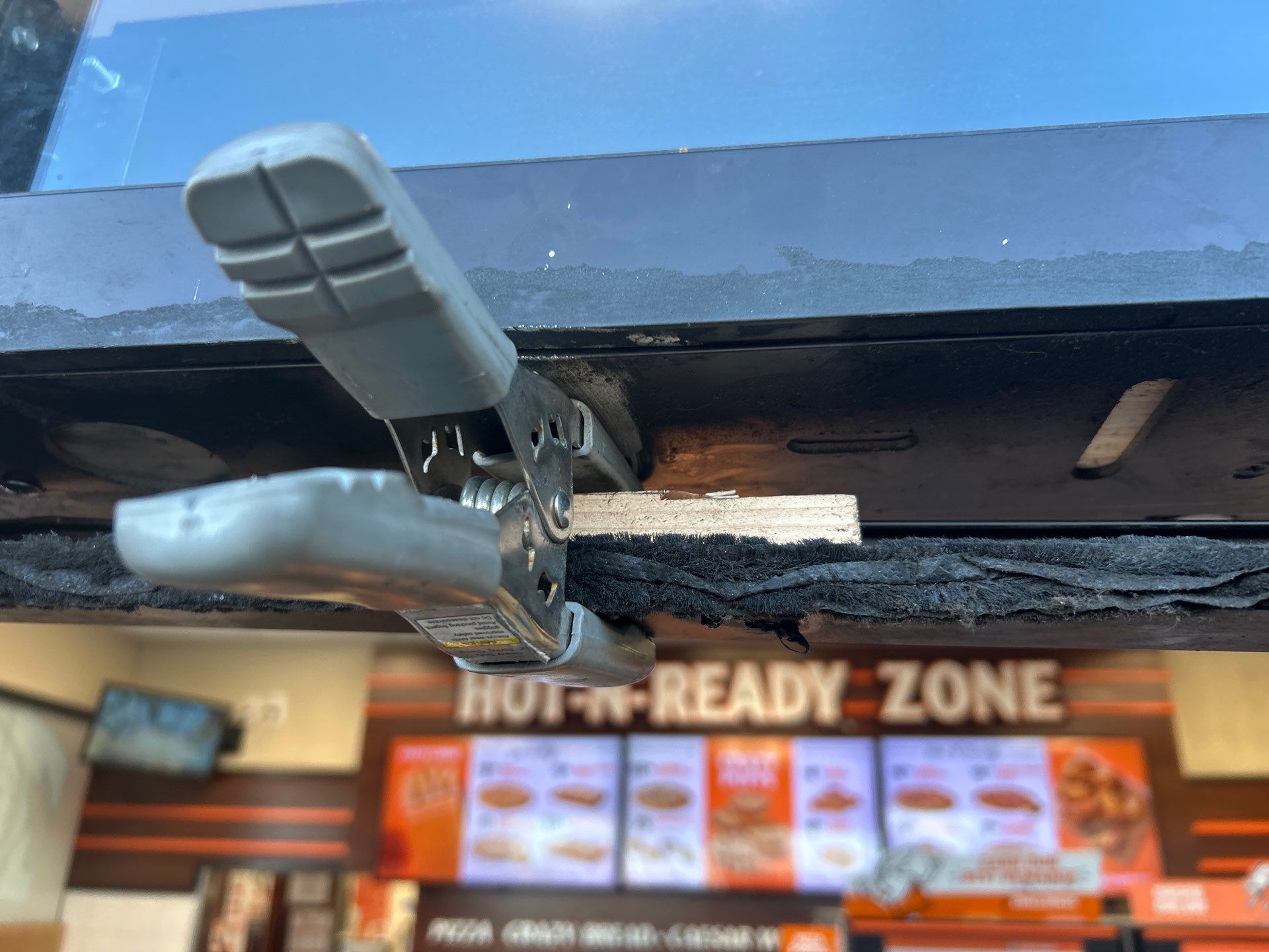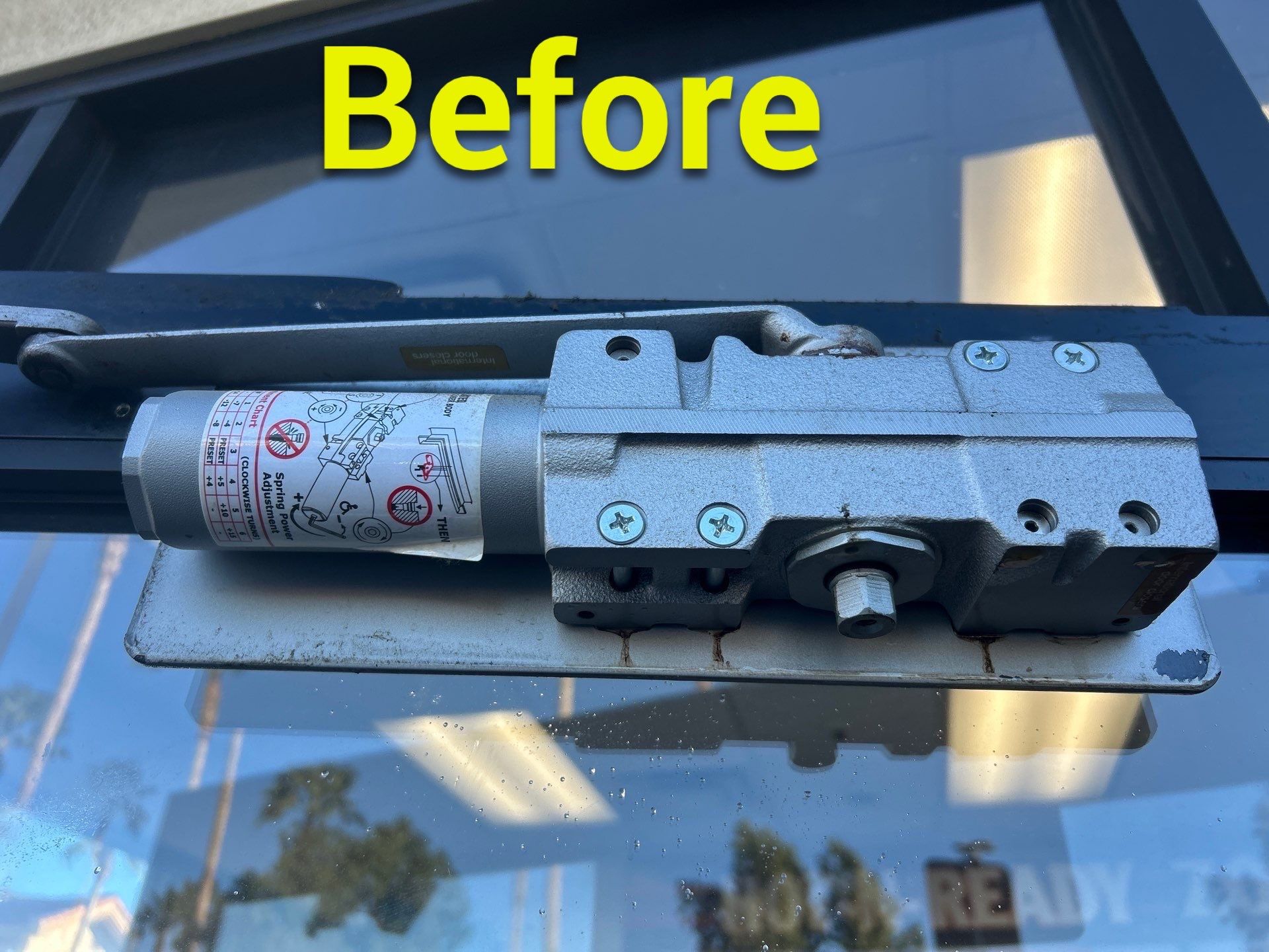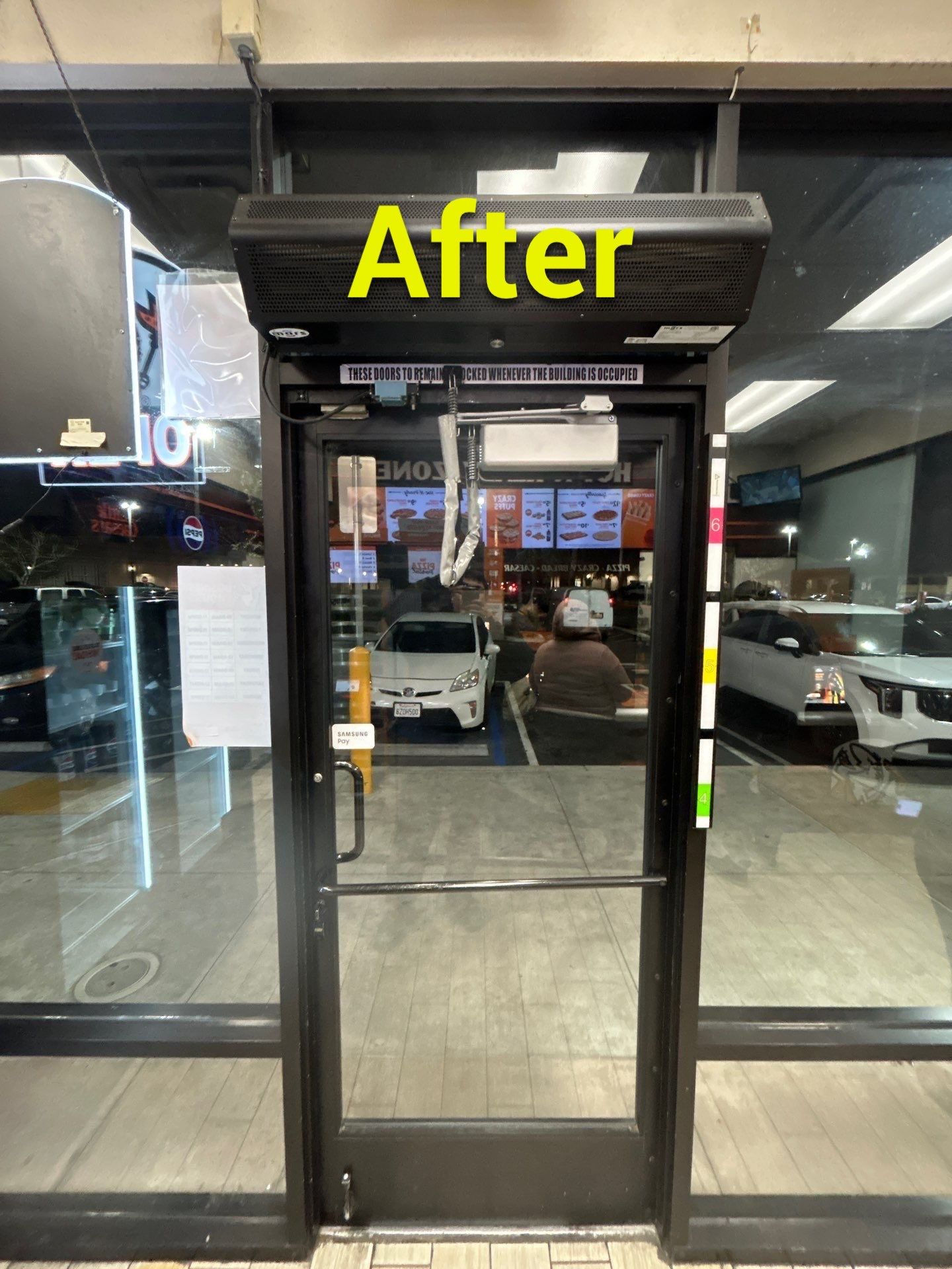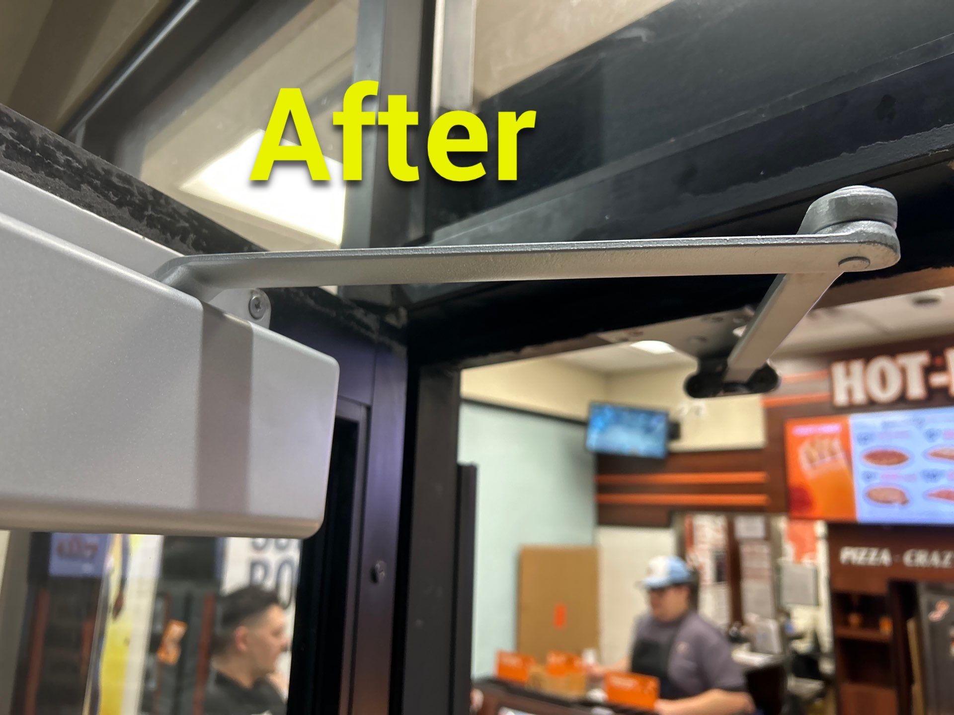 This location experiences strong and consistent winds, which place significant stress on the storefront door. To help prevent damage, the door had previously been fitted with a restraining chain with a plastic sheath. While these chains are not visually appealing and many businesses prefer not to have them, in high-wind locations they are sometimes necessary to prevent the door from swinging too far open. Without the chain, the wind could force the door open and cause damage to the door, the frame, or the adjacent glass. The chain was still intact and continues to serve an important purpose at this location.