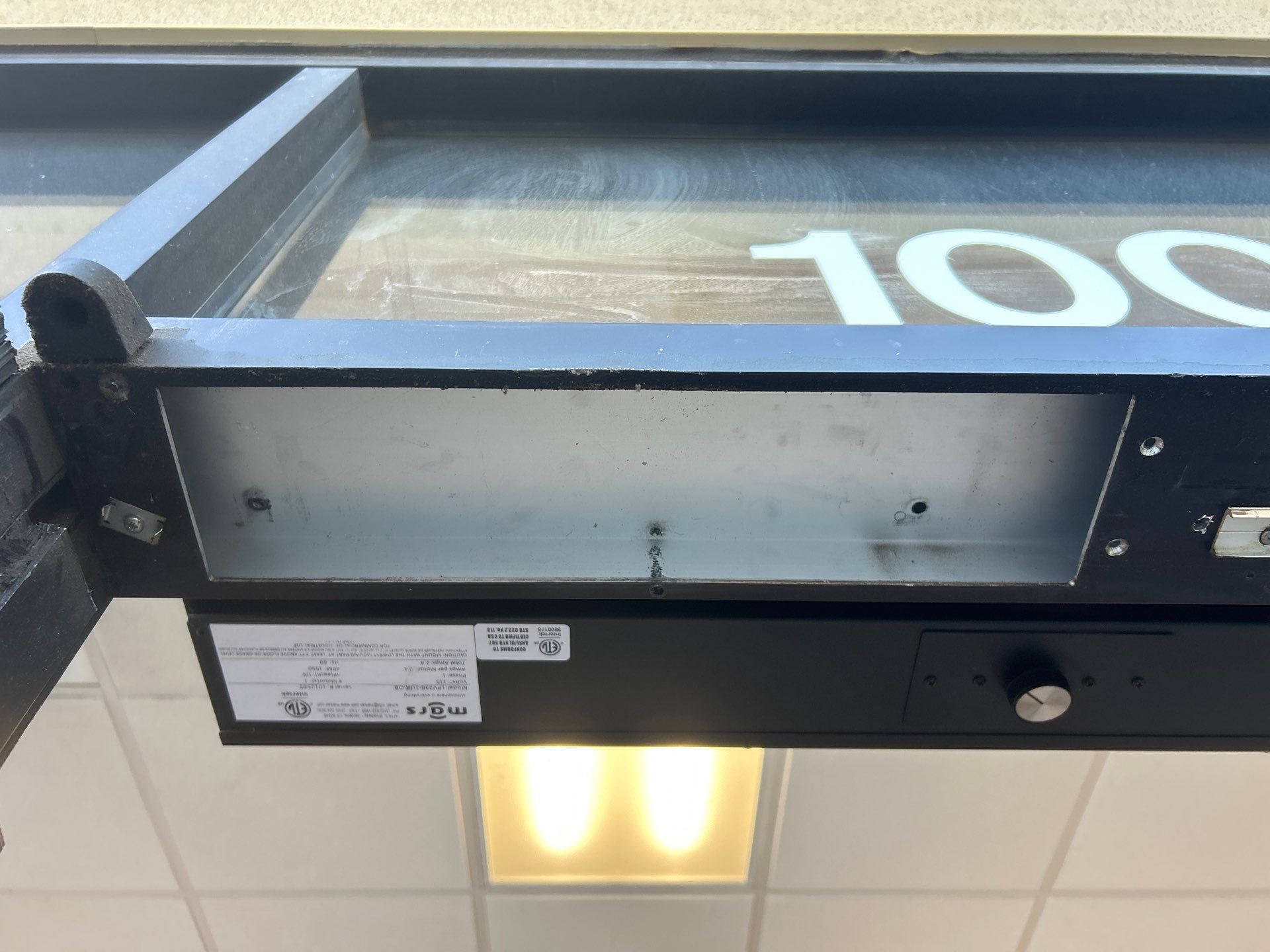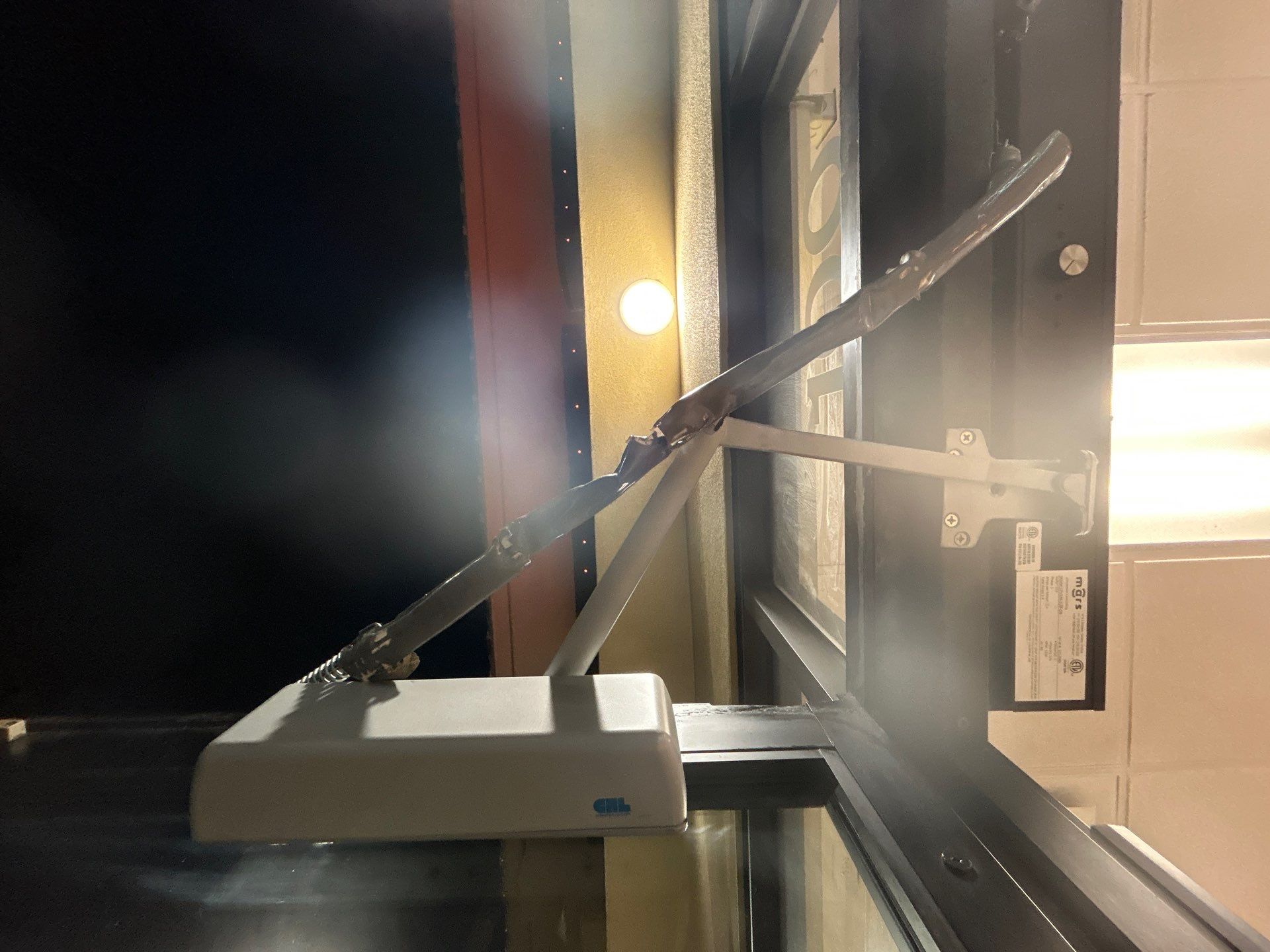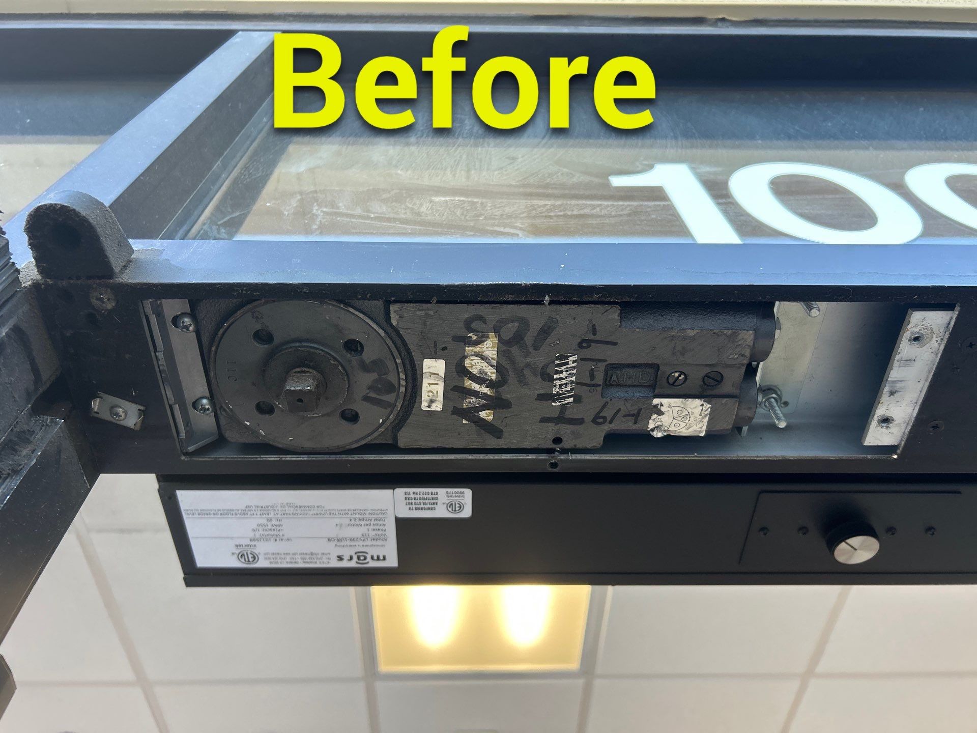 During our inspection, we identified the underlying cause of the failure. A previous door service company had installed a parallel arm plate for the surface-mounted closer, but it had been attached to a thin decorative door stop. This type of stop is typically used to conceal a concealed closer arm and is largely cosmetic. When the door was converted from a concealed closer to a surface-mounted closer, the header was not reinforced. A standard storefront header designed for a concealed closer is not strong enough to support the forces created by a surface-mounted closer, especially in high-wind conditions.
