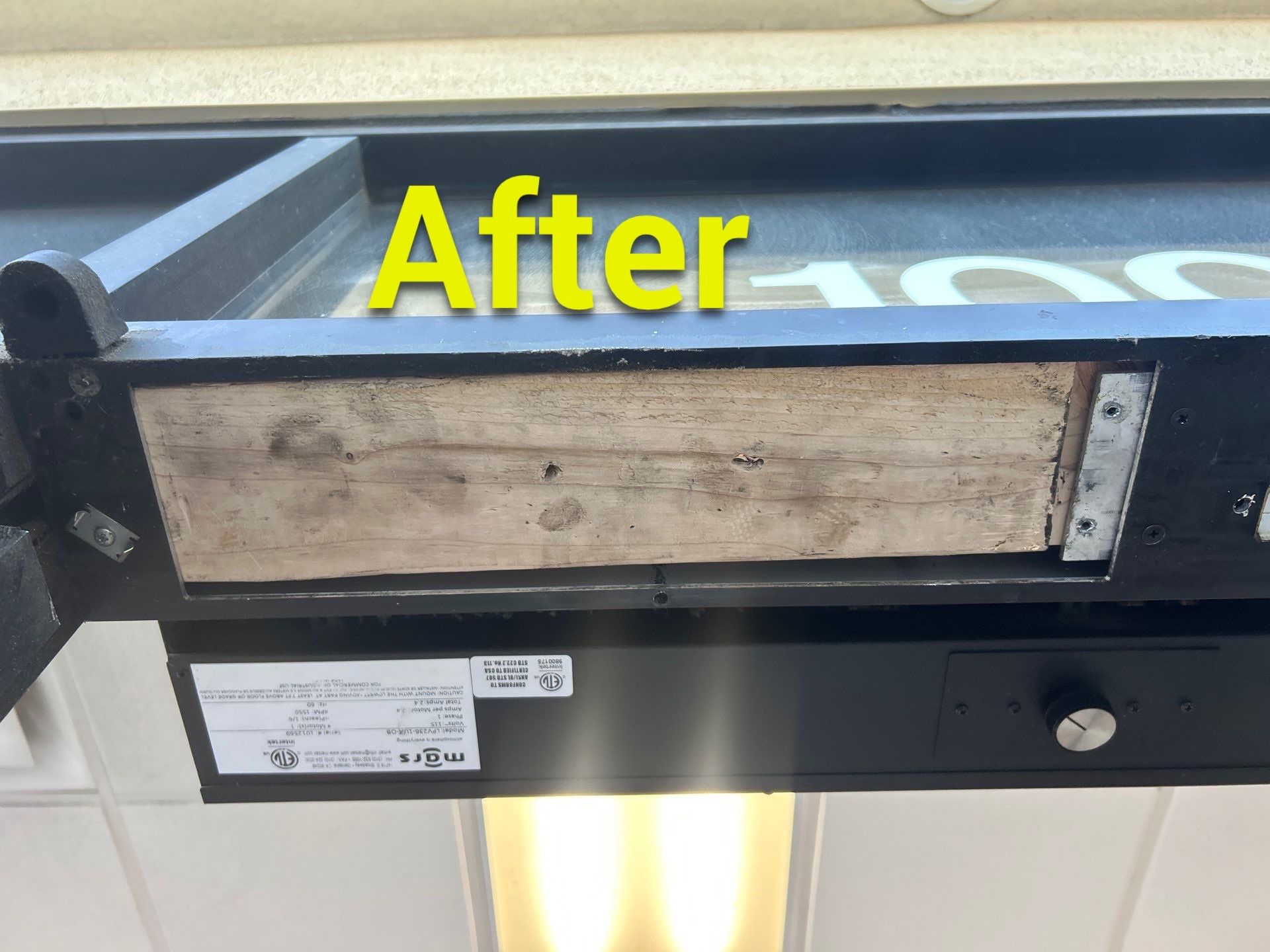 The door now operates safely and reliably, with hardware that is properly supported for both daily use and the challenging wind conditions at this site. The restraining chain remains in place because it is still necessary due to the wind exposure, and the reinforced header provides a long-term solution that addresses the root cause of the problem rather than just the symptoms.