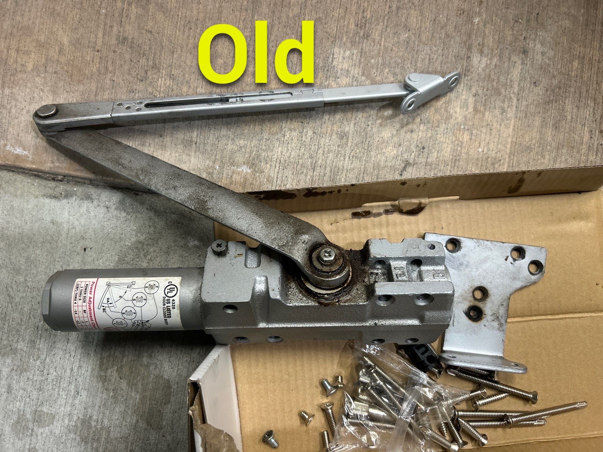We also found that the surface-mounted door closer had failed. High winds caught the door and tore the door stop and closer arm, breaking the closer and pulling hardware out of the header.