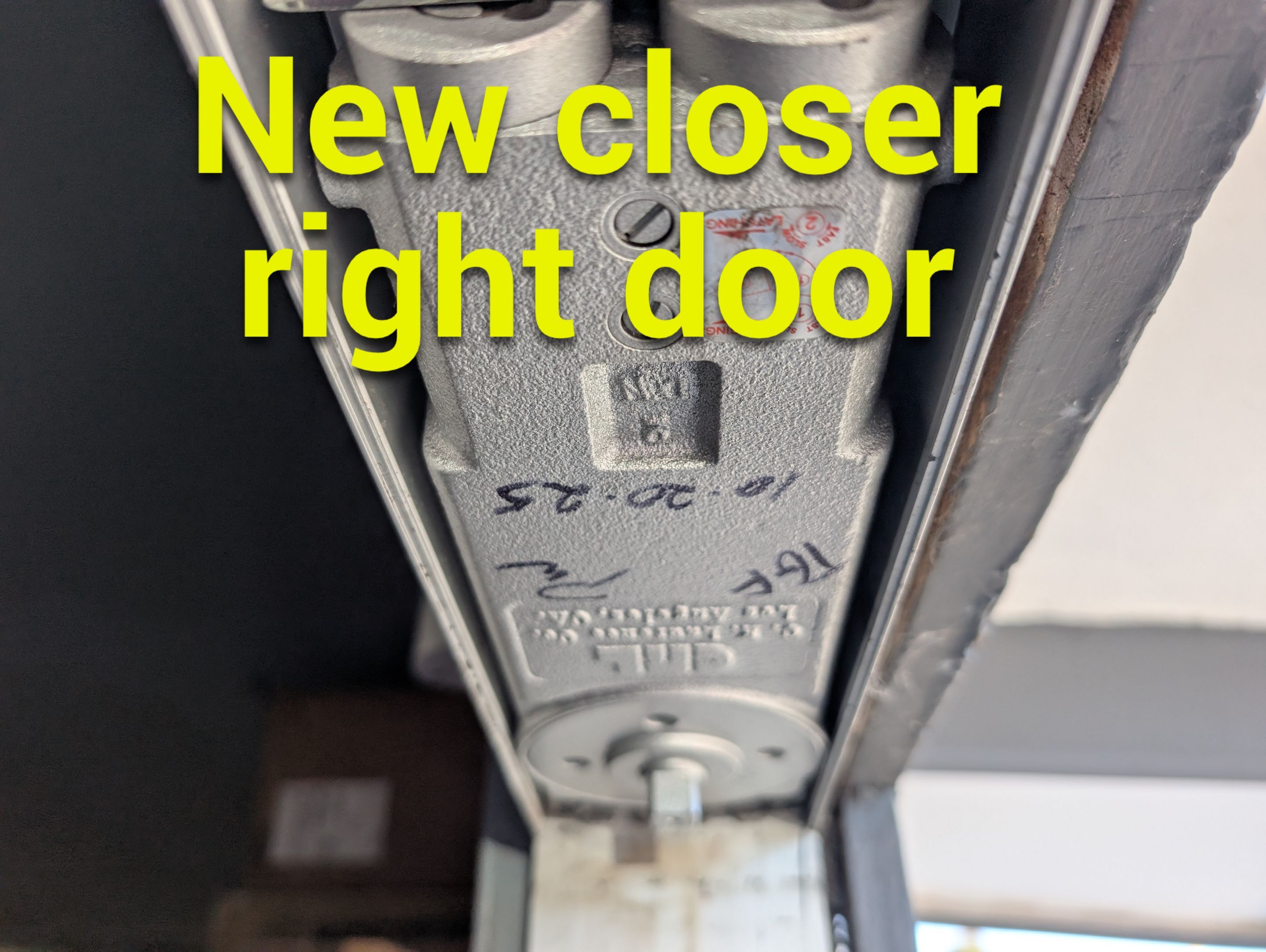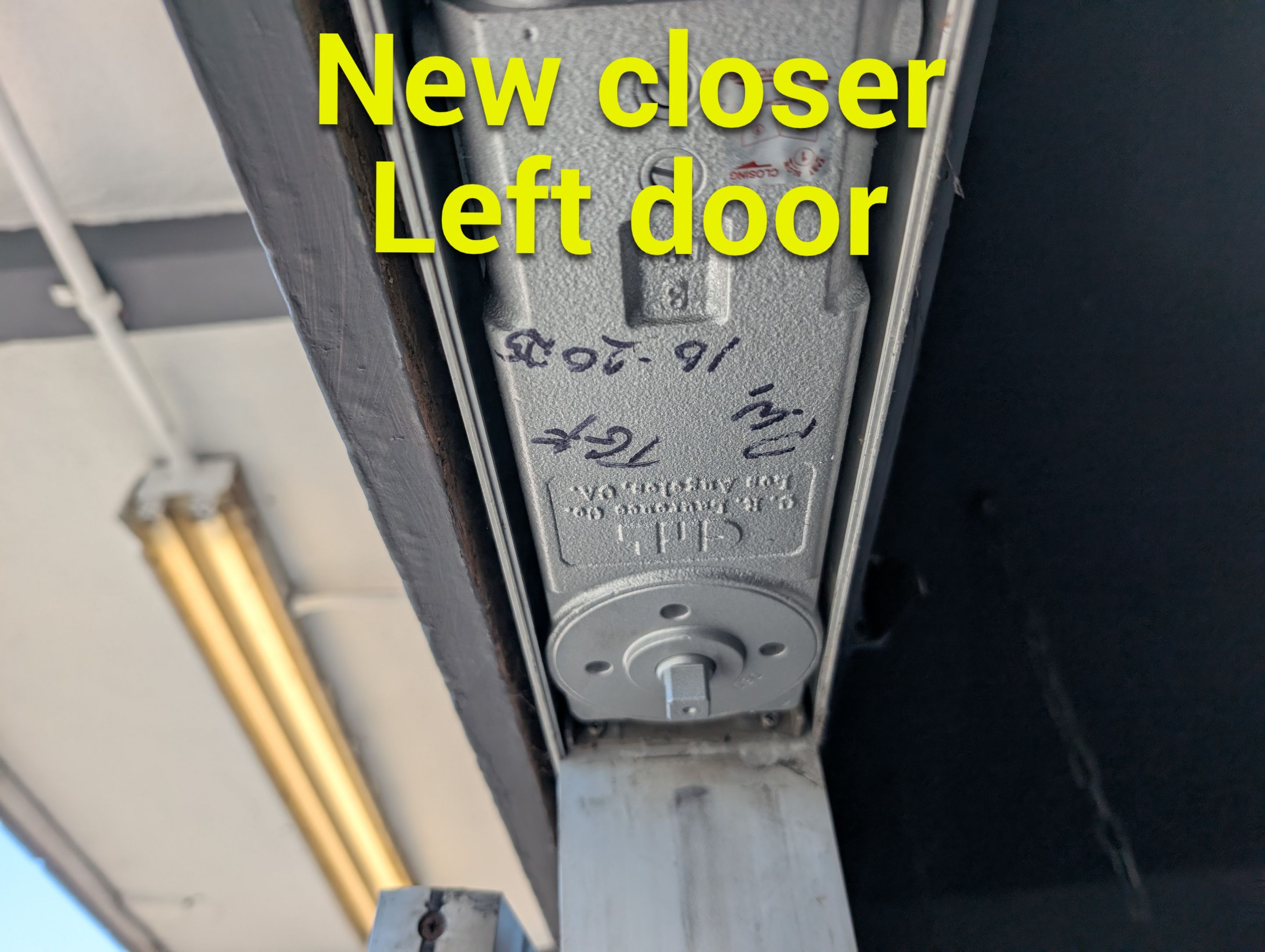 Replaced both concealed closers with new 105° hold-open models. These allow the doors to open smoothly to 105 degrees and hold open securely until gently pushed closed.