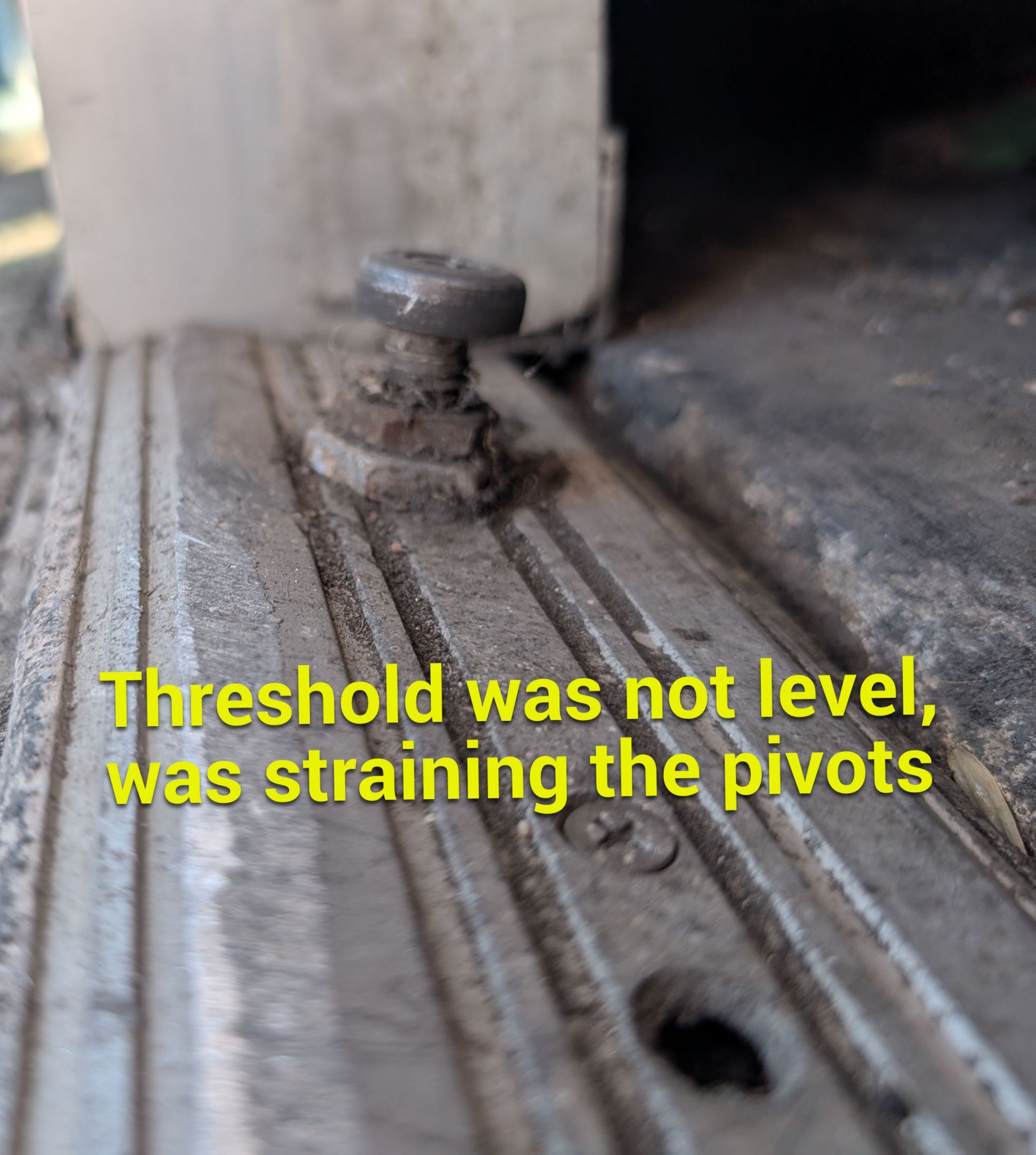 Removed and leveled the threshold, which had been leaning into the building by about half an inch, twisting the pivot bearing and accelerating wear.